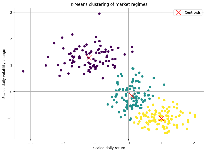 The concept is beautifully straightforward. Imagine you want to group all the trading days from the last five years into three regimes (K=3): "Bullish," "Bearish," and "Neutral." K-Means tries to find the best three central points—called centroids—to represent these regimes.