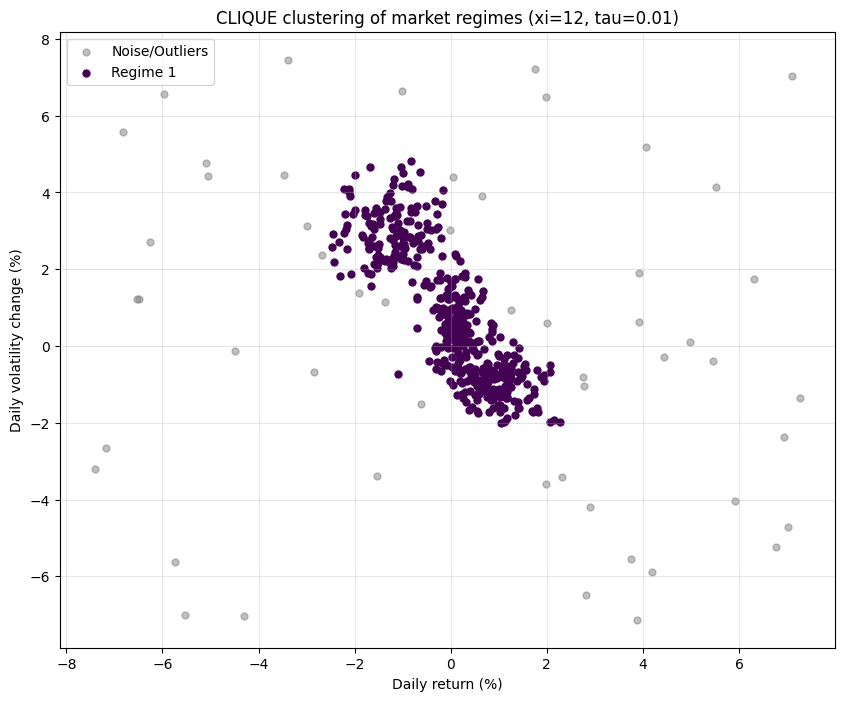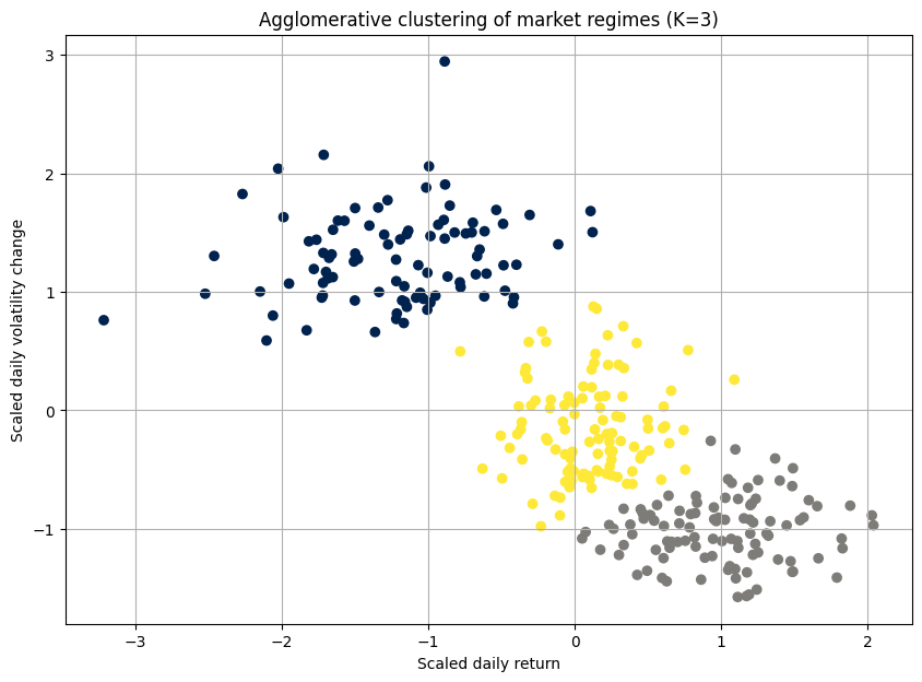 Legacy models fail because they ignore regime segmentation, akin to applying linear regression to a piecewise function. The solution lies in unsupervised learning: algorithms that detect regime boundaries without labeled data. We are going to start by something simple like clustering techniques. Features might include realized volatility surfaces, cross-asset correlation eigenvalues, orderbook imbalance metrics, or entropy measures of liquidity concentration.