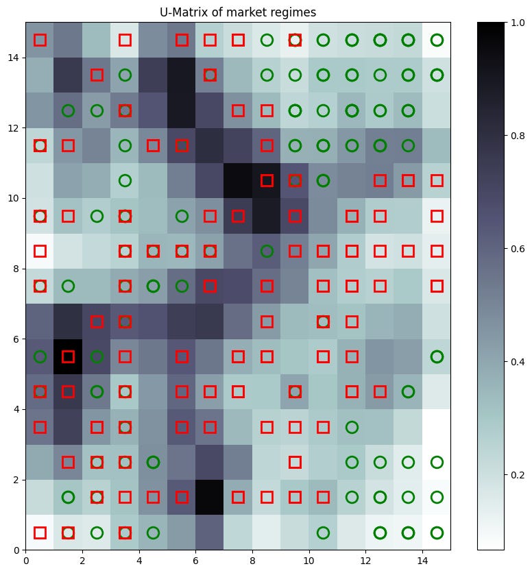 som.distance_map().TThe background colors—from the U-Matrix—would show dark rivers separating lighter plains. The colored markers show where our original, known regimes were mapped. We would hopefully see the green circles—bull quiet—clustered in one light area, the red squares—bear volatile—in another, separated by a dark border.