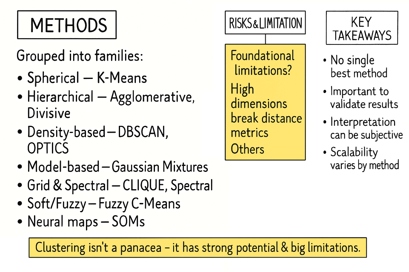 Clustering is an essential technique for exploratory data analysis, allowing us to uncover latent structures in unlabeled data. However, it is crucial to recognize that a clustering algorithm is not an oracle that reveals pre-ordained truths. It is a mathematical procedure that optimizes a specific objective, and its results are highly sensitive to initial assumptions, algorithmic choices, and human interpretation. Understanding its limitations is the key to using it effectively.