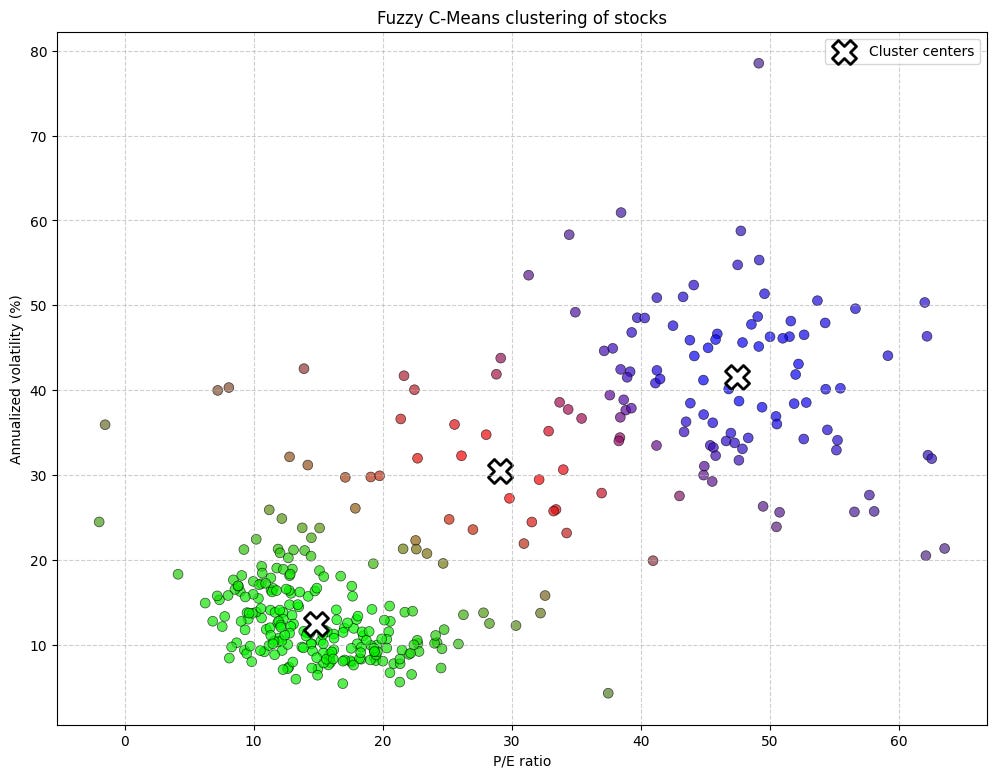 u, cluster_centers_scaled = fuzzy_c_means_simple(X_scaled, n_clusters=3, m=2)The points that appear as nearly pure red, pure green, or pure blue are the stocks that the model has confidently assigned to a single cluster. For example, the group in the top-right is likely a pure green, representing our growth stocks—high P/E, high volatility—which have a membership probability close to [0, 1, 0].