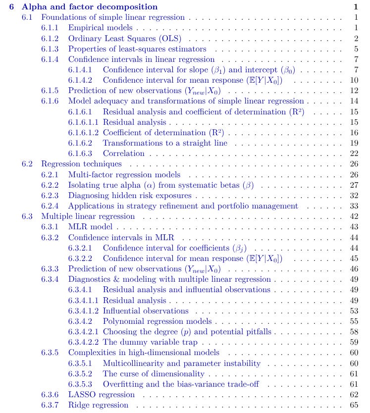 This chapter frames factor analysis as a decision tool: use regression to separate true edge (α) from systematic risk premia (β), diagnose hidden exposures, and turn findings into concrete hedges and portfolio rules. The workflow runs from simple/ multiple regression foundations to multi-factor models, statistical significance of α, rolling diagnostics, and implementation.