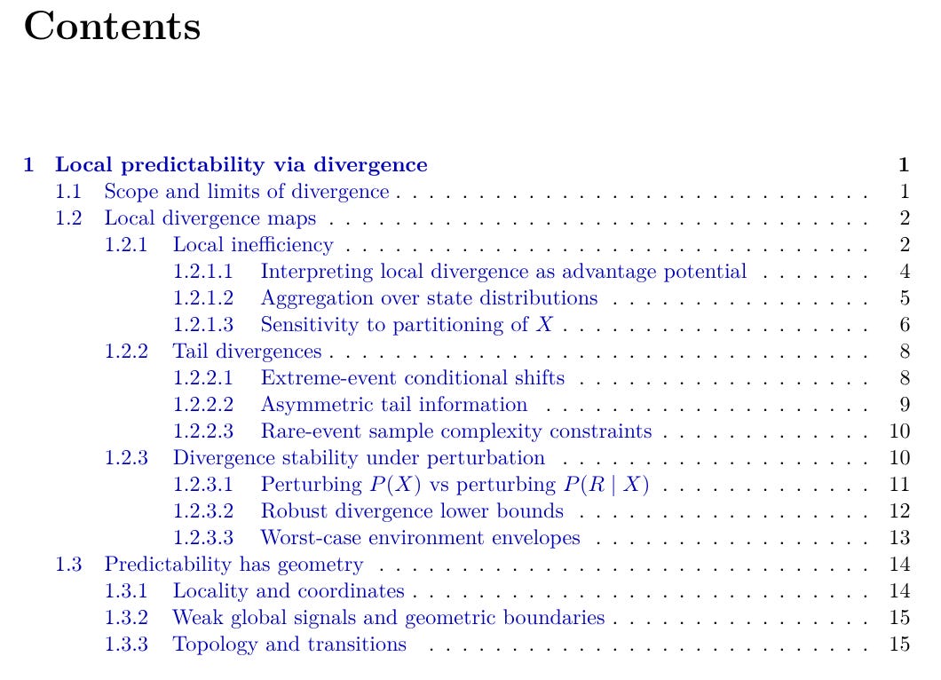 This chapter treats an inefficiency claim as a statement about distributional separation. Fix an outcome variable R and a horizon at which R is measured. The future becomes the probability law of R at decision time. The object of interest is the gap between the baseline future and the state-conditioned future, where X is a declared state variable. A divergence measures this gap by quantifying how much the predictive law of R changes when we move from “no state” to “state x,” and it keeps the research claim separate from the execution layer that turns structure into PnL.