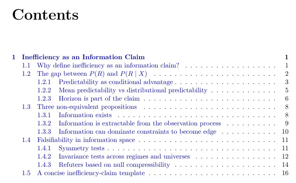 This chapter reframes market inefficiency as a falsifiable information claim: observing X must change the law of a future outcome R. The goal is to separate what is informationally true (structure in conditional laws) from what is merely tradable (edge after constraints). The workflow goes from defining the claim to testing it against strong nulls, and only then deciding whether it deserves execution and portfolio complexity.