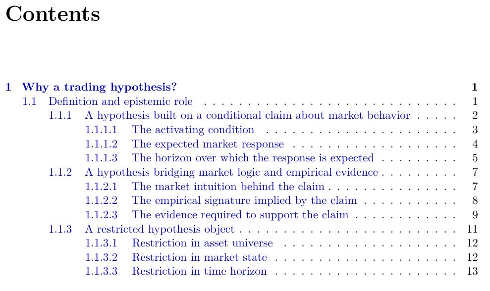 Why a trading hypothesis matters. A trading hypothesis is the first formal research object in quantitative trading because it gives direction, causal meaning, and empirical consequences to an otherwise informal market observation.