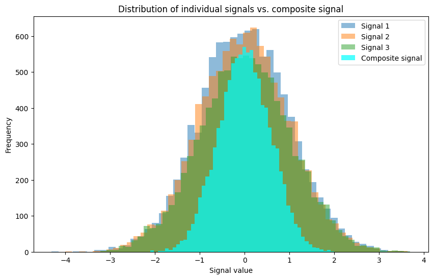 Individual signalsβshown in semi-transparent colorsβhave a wider spread due to their noise. The composite signalβin aquaβis the average of these signals. Since the noise tends to cancel out when averaging independent variables, the composite histogram is tighter, illustrating the noise reduction benefitβif you did things right π¬