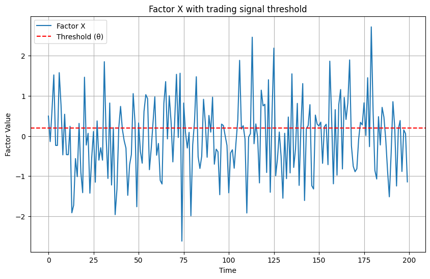 The basic building block is a factor X that informs the decision. Consider a simple strategy: if X exceeds a threshold ฮธ, we buy; otherwise, we sell.