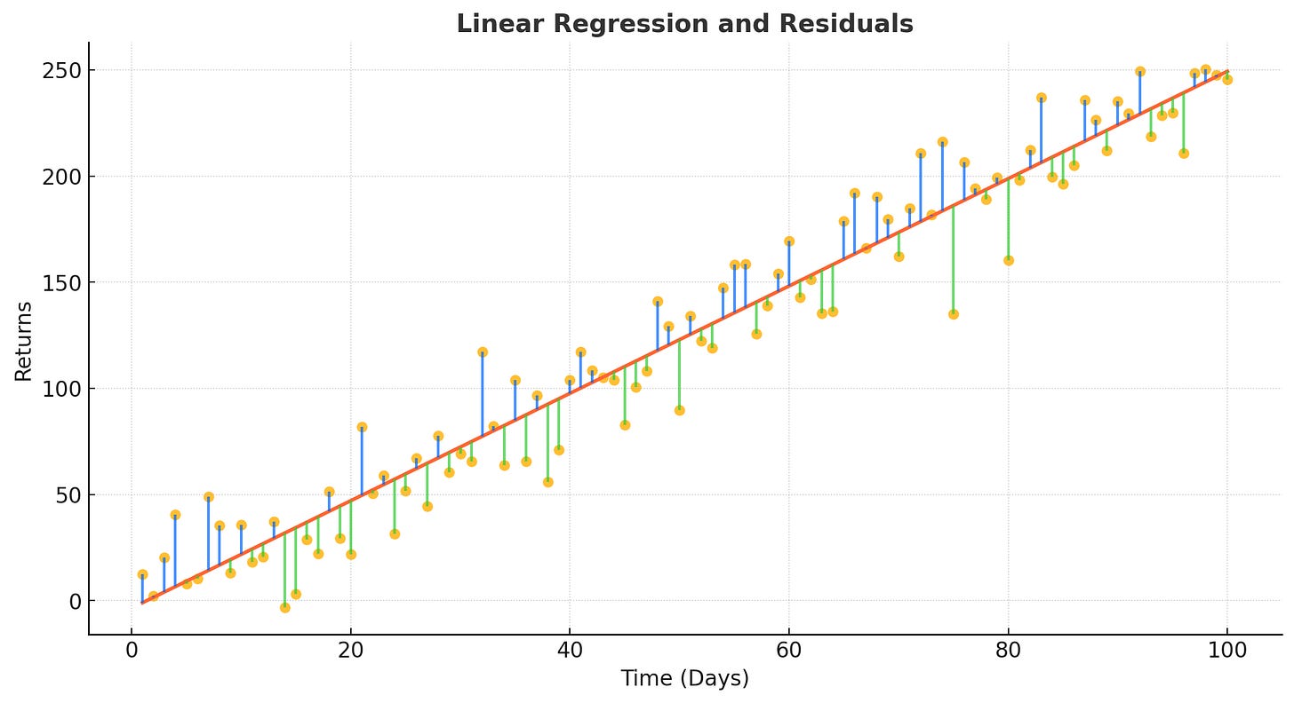 return np.linspace(pnl[0], pnl[-1], num=n) # Straight line from start to finish The devil’s in the details! Residuals are the gaps between your actual PnL and the linear model. Think of them as your strategy’s mood swings: