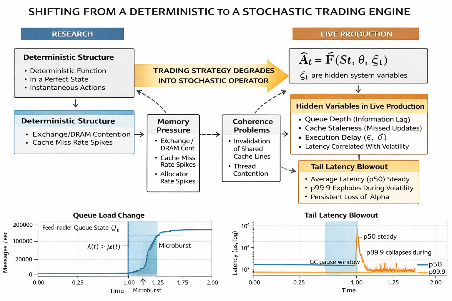 Whether the state you believed you had matches the book you actually traded against. A system that is quick most of the day yet slow precisely during clustered order-flow is not a fast system. The result? The trading system becomes hardware-dependent, shaped by queue depth, cache residency, coherence traffic, parser variability, and scheduling noise. At that point, edge becomes a random variable.