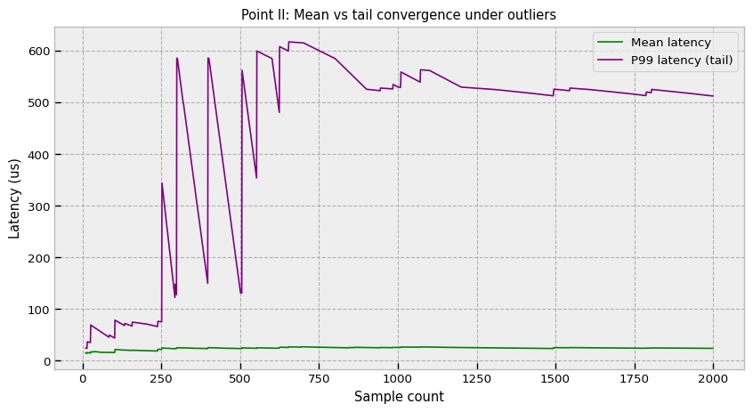 A naive average (mean) is useless in HFT because latency distributions are heavy-tailed (Power Law or Pareto-like). A slow event might be 1000x slower than the median due to an OS context switch, a minor page fault, or a Garbage Collection pause. In these distributions, the mean is a misleading artifact of the tail.