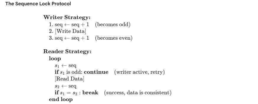 To prevent this without locking the writer (which stalls the feed handler), we use a Sequence Lock (Seqlock). A standard Mutex would force the writer to wait for readers, which is unacceptable for a feed handler that must process millions of messages per second.