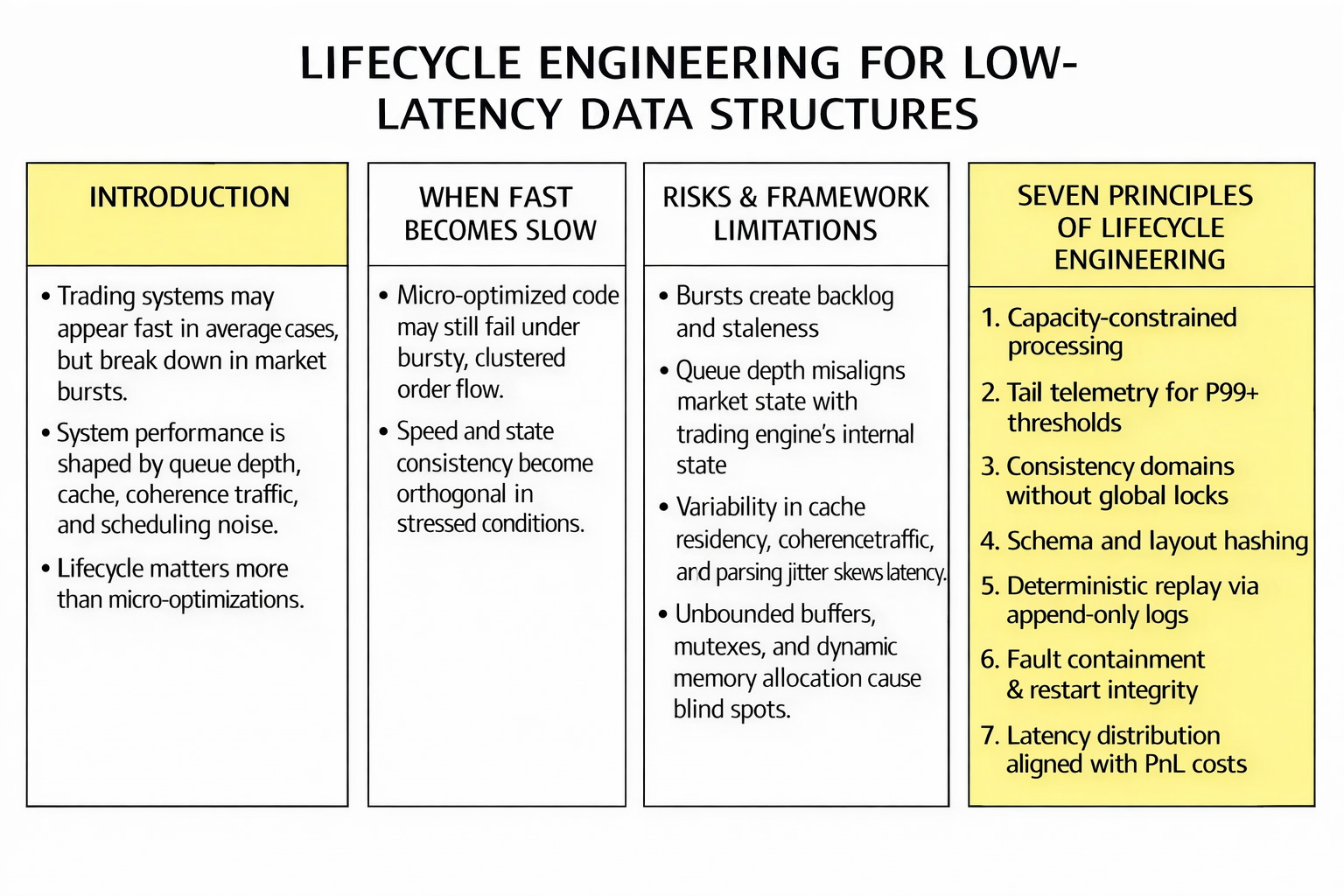 The data structure problem therefore shifts from a question of memory layout (Part I and II of the implied series) to a lifecycle problem: How is state created, mutated, observed, snapshotted, and recovered under bursty load without violating the semantic integrity of the strategy?