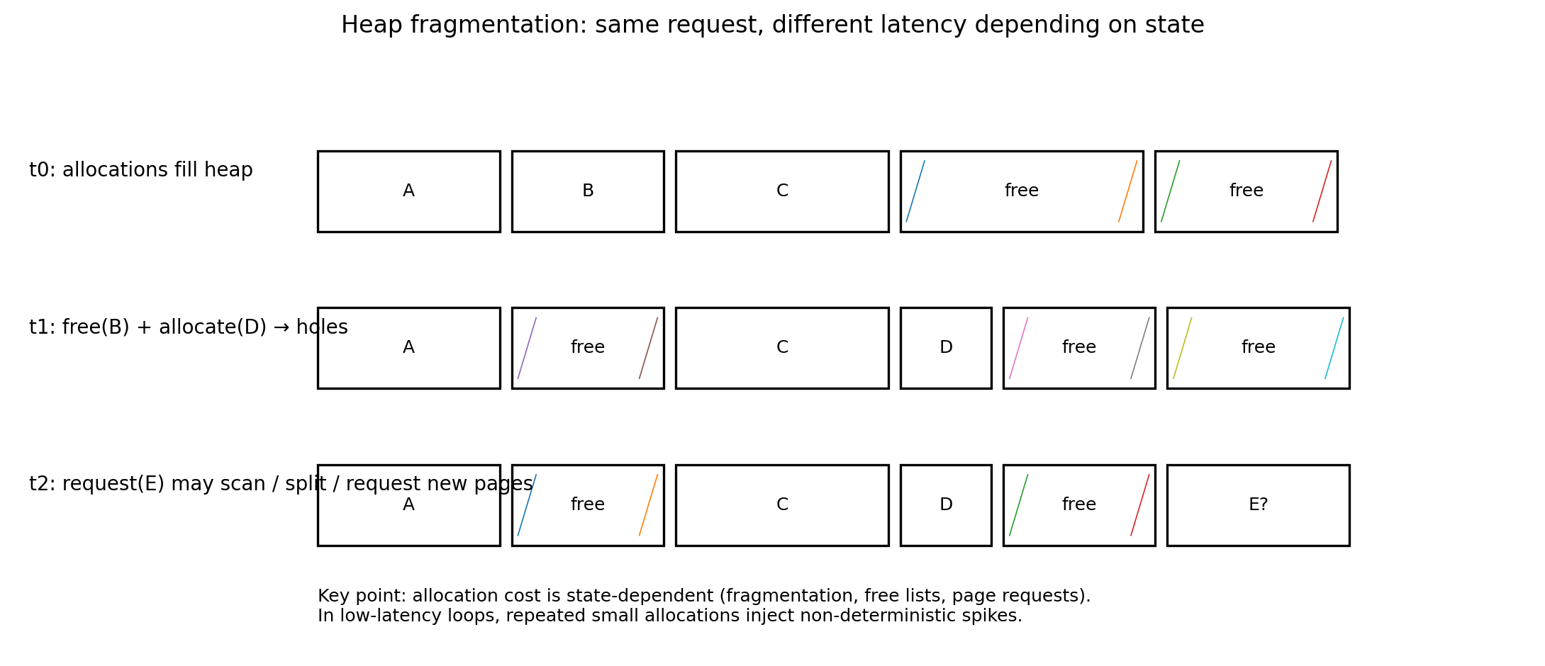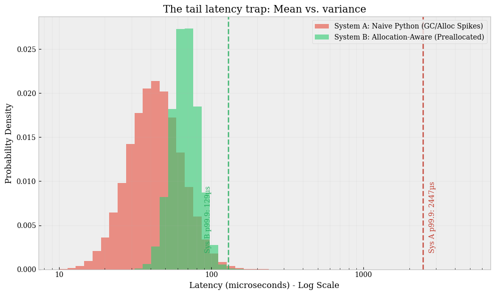 malloc/free)? Does it invoke the Python Garbage Collector? Allocation is non-deterministic; it depends on the fragmentation state of the heap at that exact moment. Requesting 64 bytes when the heap is clean might take 50ns. Requesting 64 bytes when the heap is Swiss-cheesed by fragmentation might take 5µs as the allocator searches for a contiguous block or requests new pages from the OS kernel.Latency distribution: Does the system exhibit consistent service times, or is it spiky? In trading, spiky latency is structurally worse than slower-but-smooth latency. A system with a median tick-to-trade time of 50μs and a p99 of 5ms is significantly more dangerous than a system with a median of 100μs and a p99 of 120μs. The former implies that during a burst, the system effectively collapses. This collapse creates stale orders resting in the book, waiting to be picked off by faster competitors who have already updated their valuation models using the new market data you haven’t processed yet.