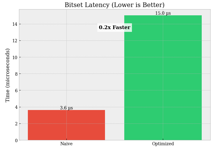 This 8x improvement in symbols per cache miss is the single biggest optimization for iteration speed. When you scan a universe of symbols to filter for tradable opportunities, the bottleneck is almost always memory latency (waiting for data to arrive from RAM). Bitsets reduce this wait time by 87.5%.
