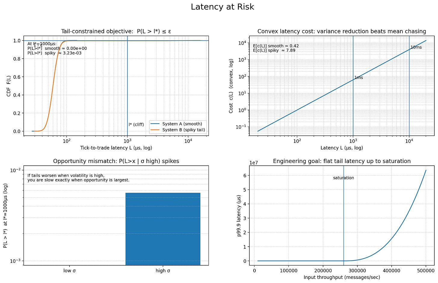 This aligns with standard risk management frameworks. Just as we calculate Value at Risk to understand tail financial loss, we must calculate Latency at Risk to understand tail execution failure. If the cost of latency c(L) is convex—meaning a 10ms delay costs more than 10x a 1ms delay (common in momentum bursts where the price moves away exponentially)—then reducing the variance of L yields a significantly higher improvement in Expected PnL (E[π]) than reducing the mean.