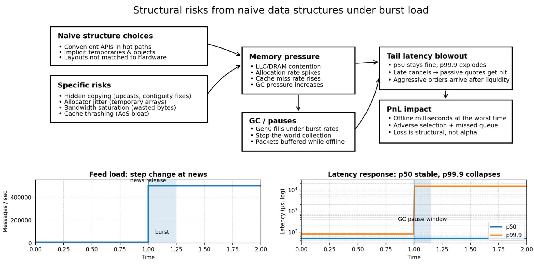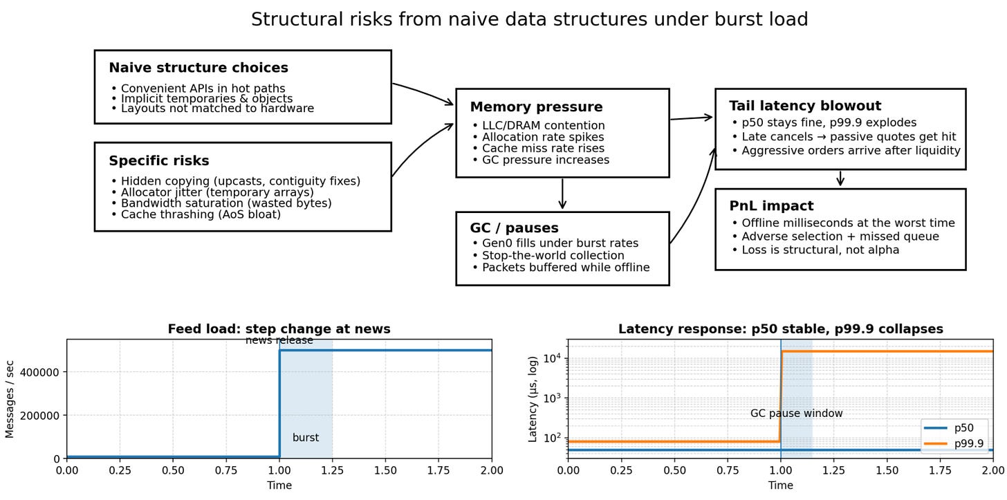 Today we take a different stance: the execution pipeline is a risk book, and data structures are positions inside it. Each allocation, copy, branch, cache miss, and serialization step is exposure—not in dollars, but in timing error. If your system occasionally becomes unavailable for milliseconds, you are effectively holding stale orders with unpriced optionality against faster participants.
