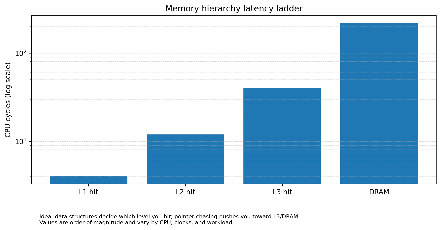 Memory access patterns: Modern CPUs depend heavily on hardware prefetchers to predict which data to load into the L1 cache before the instruction requests it. Prefetchers thrive on linearity. Are we reading contiguous blocks, or are we chasing pointers across the heap? Random access into a fragmented heap results in Cache Misses (L1/L2/L3). A single L3 cache miss can stall the CPU pipeline for 300+ cycles. If your data structure requires three pointer dereferences to read a price (e.g.,