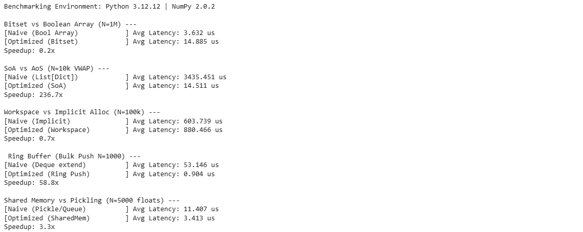 The optimizations detailed below—risk budgeting, bit-level encoding, memory layout, and allocation discipline—constitute the core optimization phase. These are not micro-optimizations but structural changes required to prevent the Python interpreter and the OS kernel from becoming the bottlenecks.