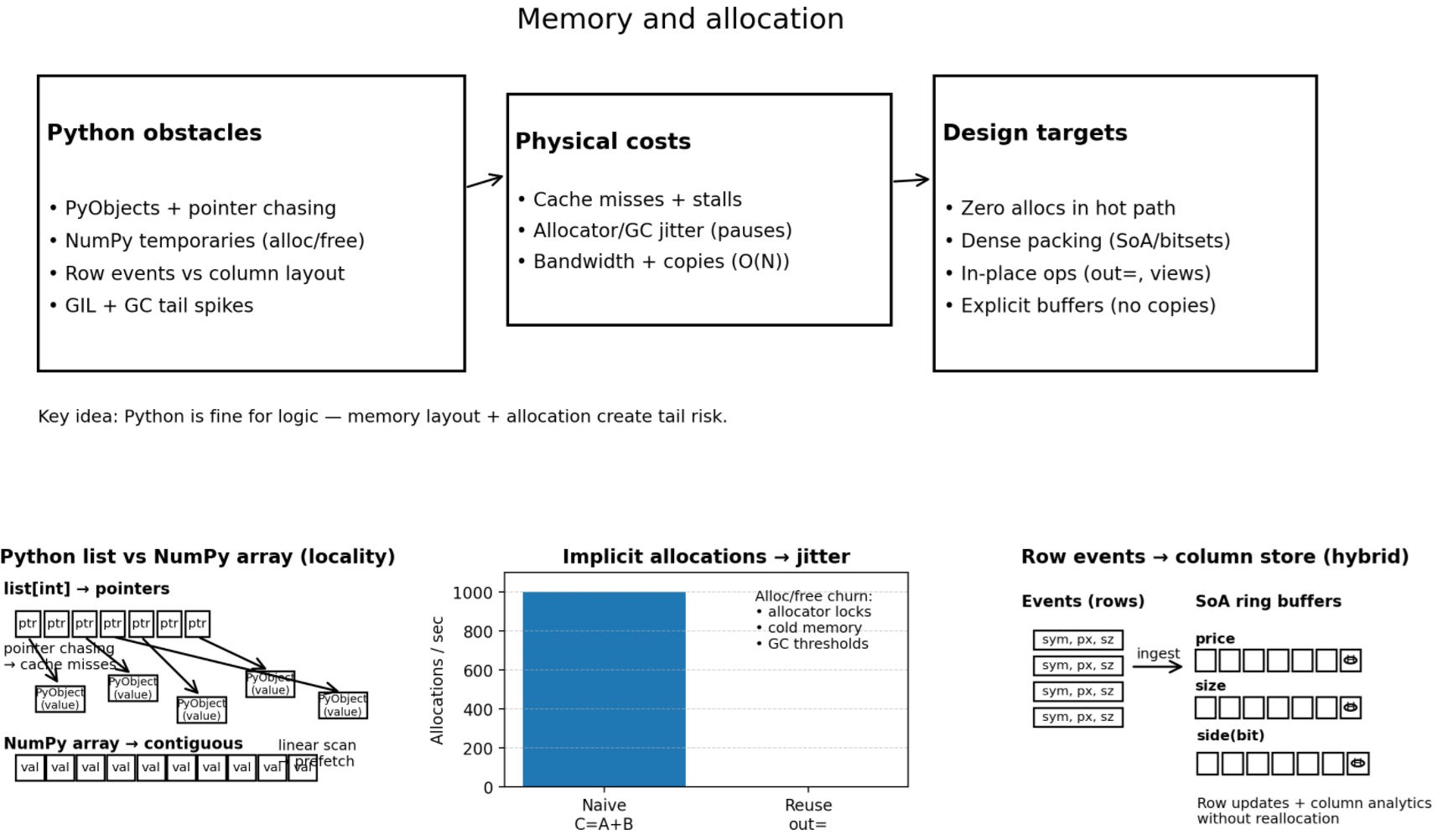 Allocator involvement: We want zero allocations in the hot path. All memory must be claimed at startup. We want to treat Python as a static memory language within the critical section.
