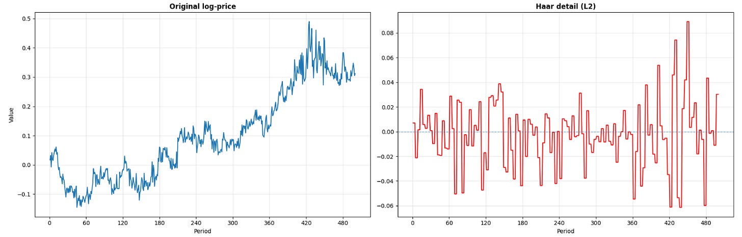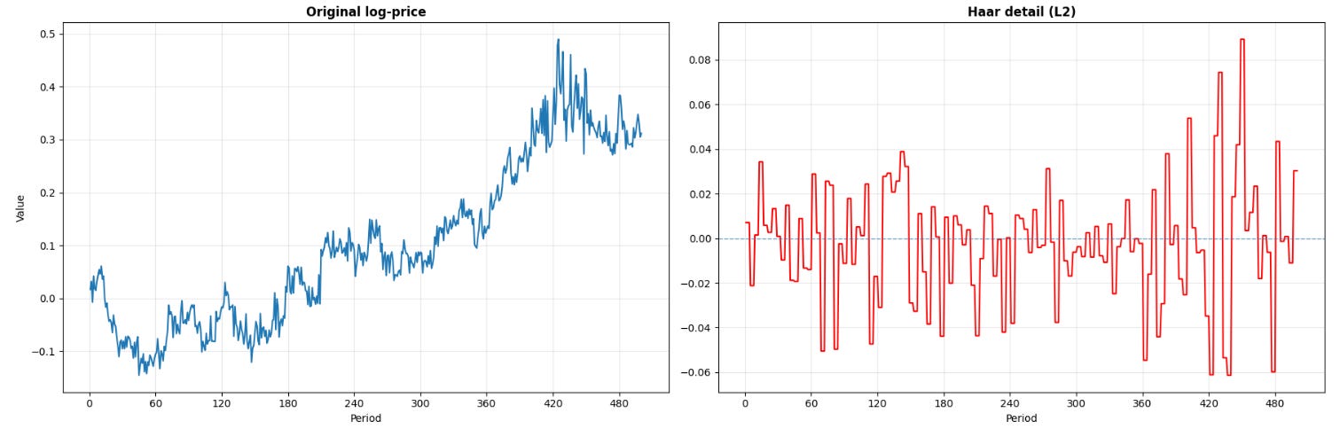Applied recursively in a cascaded architecture, the algorithm generates multiscale approximation coefficients and detail coefficients. A detail coefficient extracted at Level 2 represents the difference of the local averages computed at Level 1. This distinction allows to target a specific frequency band—a precise temporal horizon—rather than defaulting to the single-step increment forced by standard return calculations.