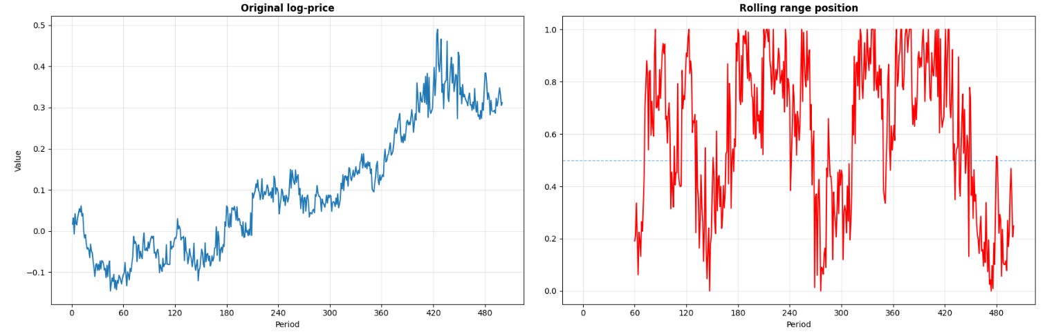 The fifth and final transformation algorithm in this framework is the rolling range position. While computationally less complex than state-space estimators or orthogonal wavelets, it introduces non-linear geometric modifications. In fact, it converts a non-stationary price path into a bounded state occupancy variable.