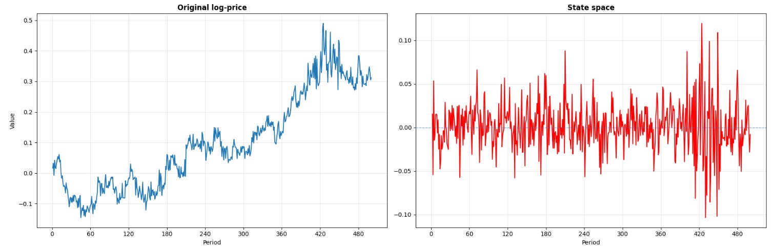 The first targeted transformation is the state-space. In technical literature, this is defined as the one-step-ahead prediction error derived from a local linear trend state-space model. This transformation alters the time-series geometry by removing the exact variation that the internal state estimate already expects the system to produce at time t. This isolation mechanism is required when the raw log-price is cumulative, exhibiting a smooth drift that masks the actual high-frequency surprise component necessary for short-horizon prediction.