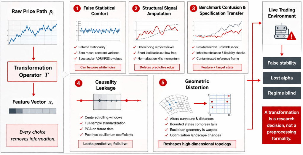 That is why data-shape transformation sits at the true front line of feature engineering. The problem is whether the operator used to create that series preserves the economic structure that generates predictive edge. A feature can look impeccable under statistical diagnostics and still be useless in live trading. It can pass every formal test of stability while removing the component that contained the alpha.