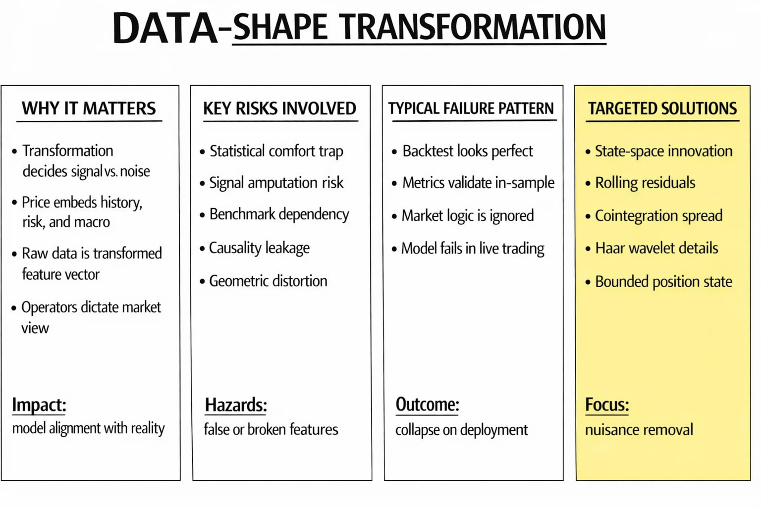 This article examines that hidden fault line. It argues that data-shape transformation must be treated as a structural modeling choice rather than a preprocessing convenience. We will identify the main risks introduced by transformation operators, explain how they distort the topology of predictive information, and then study five targeted transformations designed for distinct market nuisances: state-space innovations, rolling benchmark residuals, cointegration spreads, multiscale Haar details, and rolling range positions. The objective is not to make features look cleaner. The objective is to ensure that the shape of the data remains faithful to the market mechanism the model is supposed to learn.
