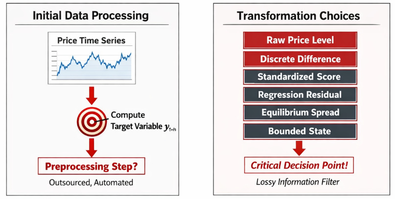 The starting phase of feature engineering contains a severe trap because it masquerades as a trivial data processing step. A quant team downloads a time series of prices, computes a target variable, and faces the decision of whether the predictive model should ingest the raw level, a discrete difference, a standardized statistical score, a regression residual, an equilibrium spread, or a bounded state variable. The standard academic and industry reflex is to treat this decision as a technical prerequisite, often labeled preprocessing or data normalization. That classification is a mistake.