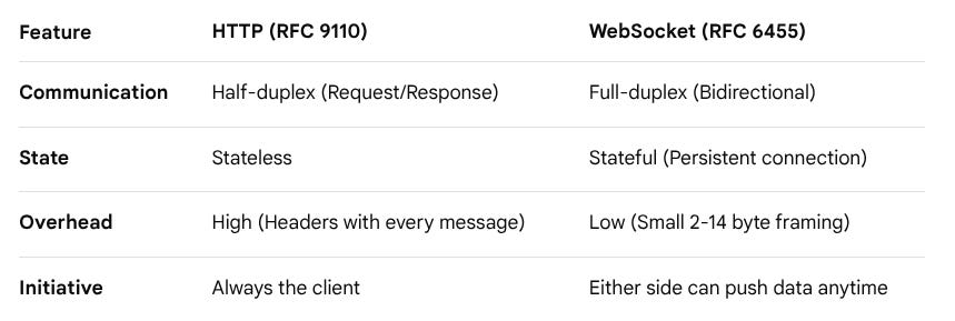 HTTP also channels interaction through discrete exchanges. Applications that consume a continuous stream of trade events, order updates, heartbeats, or PnL deltas benefit from WebSocket. RFC 6455 defines a bidirectional protocol over TCP with an opening handshake and framed messages, built for two-way communication.