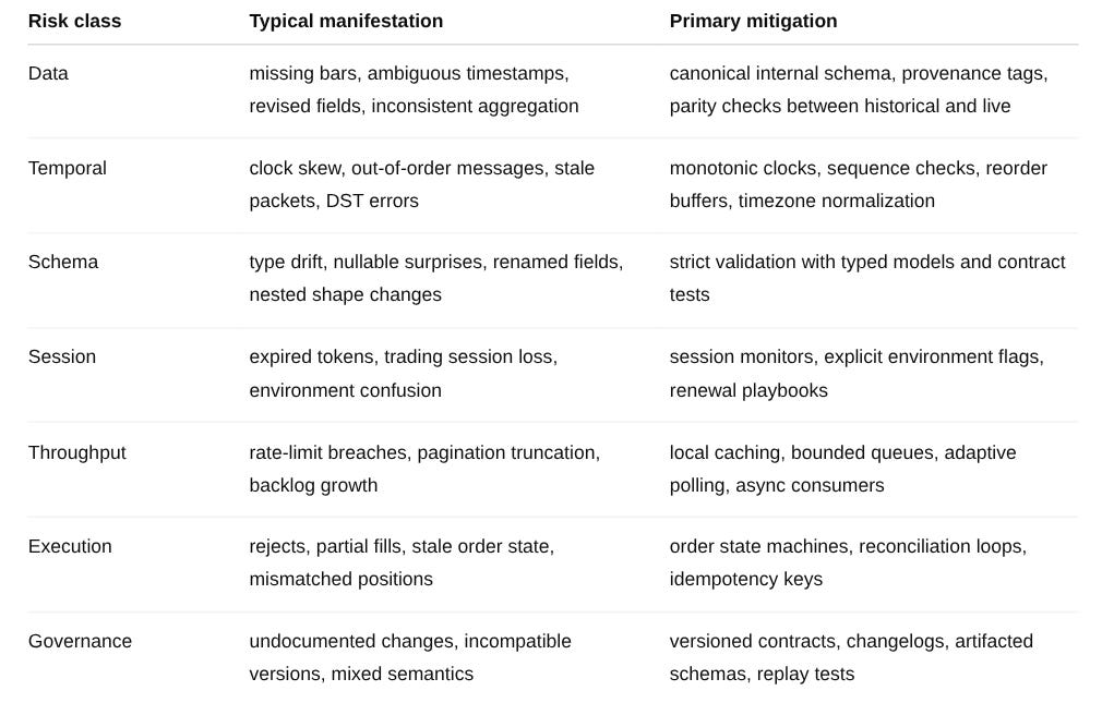 Governance risk covers versioning, deprecation, environment drift, and organizational ambiguity. An internal API that is undocumented, lacks version tags, or mixes research-only fields with live-only fields can corrupt an otherwise sound strategy. Governance is what keeps the contract stable long enough for experiments to be comparable.
