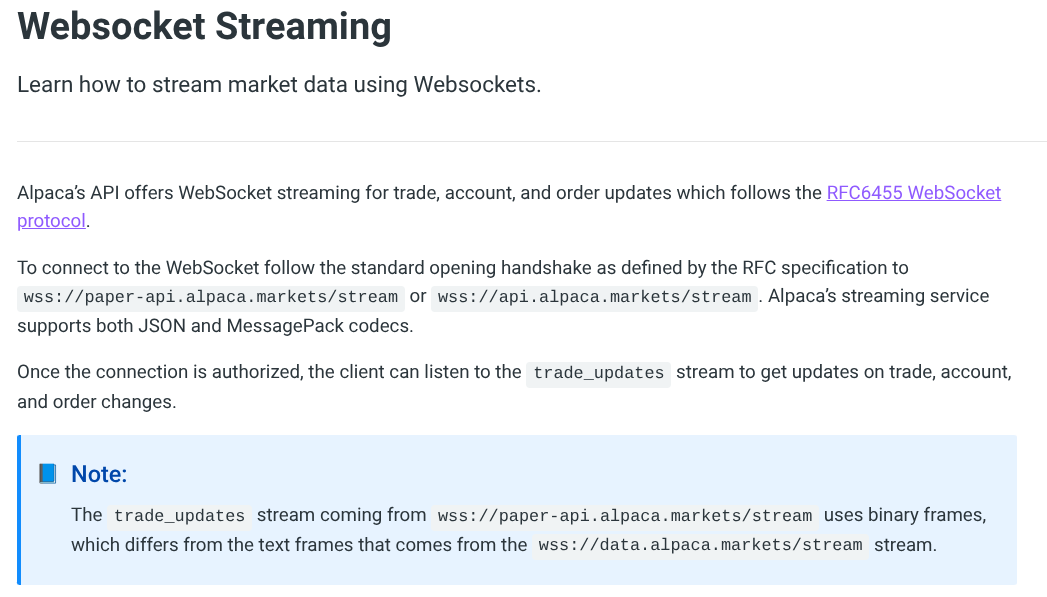 For example, Alpaca’s streaming documentation—I mean, the broker—presents trade, account, and order updates over WebSocket and highlights frame types across endpoints, plus authorization and stream subscription after connection. For a quant system, the implication is clear: WebSocket provides continuity, and continuity assigns responsibility. A persistent connection requires reconnect handling, duplicate control, interval recovery, subscription replay, sequence validation, and local buffering.