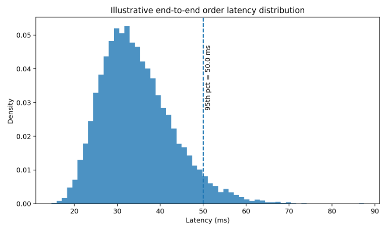 A robust analysis evaluates the whole sum. In many implementations, Tbroker and Treconcile generate more variation than raw network travel time. Serialization, authentication, request signing, broker throttling, internal queuing, and local reconciliation can dominate the tails. Tail behavior matters more than averages because losses tend to concentrate there. A mean delay of 20 ms with a 95th percentile of 60 ms may fit one strategy and damage another whose edge concentrates in short-lived bursts.