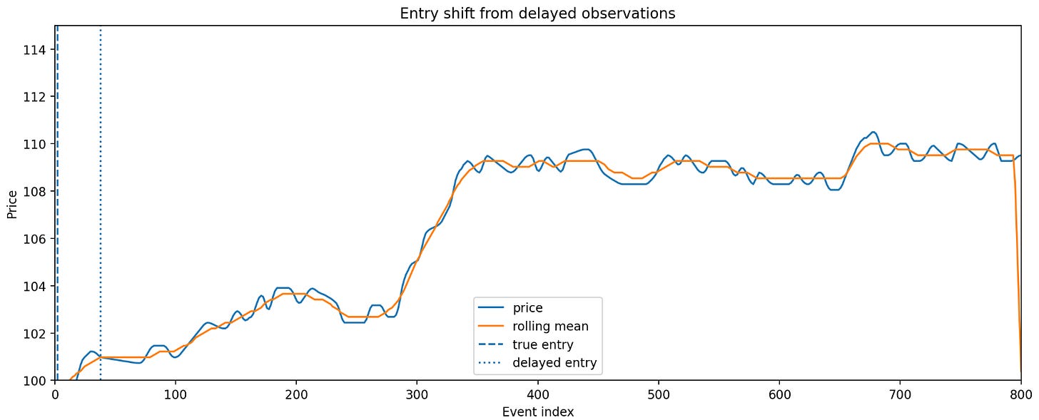 The next plot shows the operational consequence of delayed observations on a simple synthetic crossover-style entry. The delayed observation sees the same price path later and enters later. The lesson is that even modest observation delay can transform entry timing in a way that a clean historical backtest never exposed.