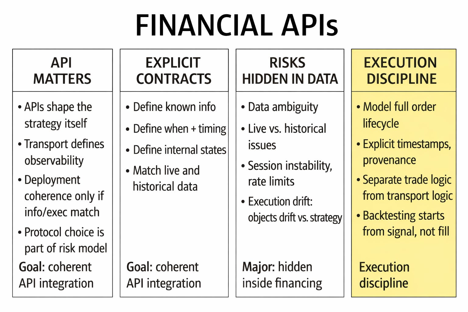 In a trading system, the central question asks what is known, when it becomes known, and which representation carries it. The API layer lives at that boundary. It defines the admissible information set available to the strategy at decision time. That framing captures the practical source of failure with precision.