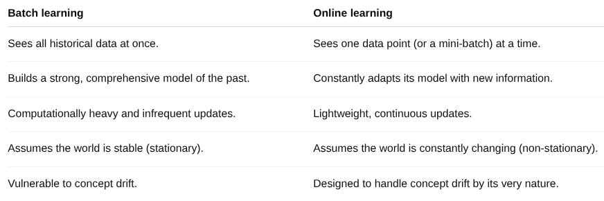 Since online models learn sequentially, a model trained on past data may become inaccurate as the underlying data distribution shifts. This can happen suddenly (e.g., due to a market crash) or gradually (e.g., changes in customer behavior).