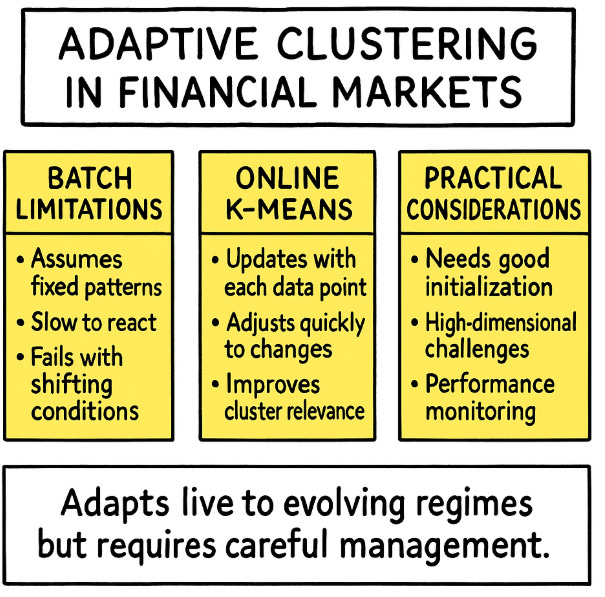 Thatβs exactly why Sequential Online K-Means isn't merely an incremental improvementβit's a fundamentally different, smarter way of thinking. Unlike batch methods, it doesnβt rely on outdated snapshots. Instead, Sequential Online K-Means is dynamic, learning and adapting continuously with each incoming data point. Think of it as a real-time heartbeat monitor, updating its understanding of market regimes tick by tick, trade by trade, and responding promptly to subtle shifts and significant shocks alike.