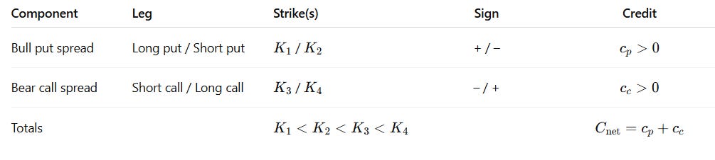 \(c_p=\text{credit from put spread},\qquad c_c=\text{credit from call spread},\qquad C_{\text{net}} = c_p+c_c.\)Now we define wing widths