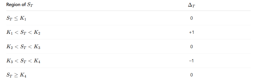 At expiry the position delta (slope of ฮ ) is 0,โ+1,โ0,โโ1, across the five regions; gamma is zero except at the kinks K1, K2, K3, K4โ.