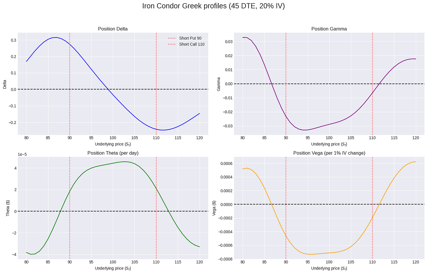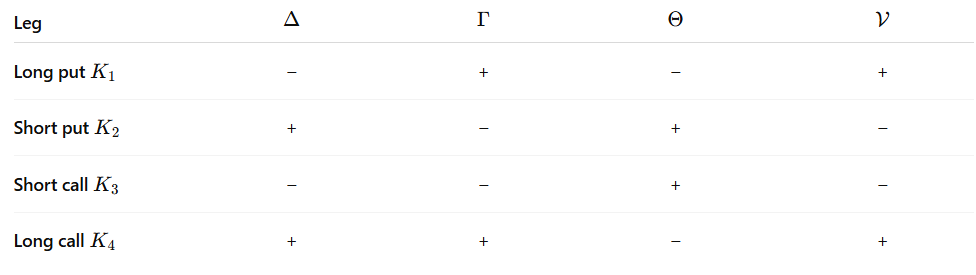 The aggregate Greeks of the four legs define its behavior. Where the price is simply the sum of the prices of its components: Vcondor=P(K1)โP(K2)โC(K3)+C(K4)