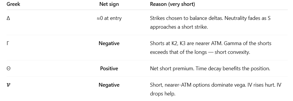 \(K_1<K_2<K_3<K_4,\)with the trade typically centered so that the entry spot S0โ (and the expected STโ) lie between K2โ and K3โ.