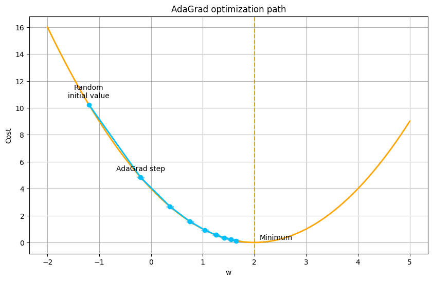 return w_historyAs you can see, AdaGrad converges nicely to the optimal solution. The adaptive nature of the learning rate allows it to make large steps at the beginning when the gradients are large, and smaller steps as it approaches the minimum. This is a significant improvement over the fixed learning rate of SGD. However, these methods are not a panacea. They introduce new hyperparameters of their own (the global learning rate η, the decay parameter γ in RMSprop, and the momentum parameters in Adam). While these are generally less sensitive than the learning rate in SGD, they still require some degree of tuning. The quest for a truly parameter-free algorithm continues.