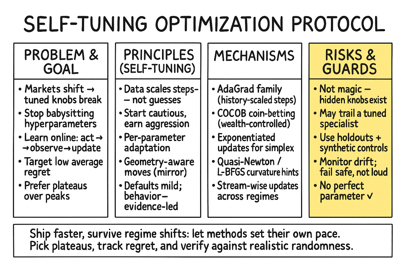 This cycle of manual re-tuning is a losing battle. It’s reactive, not proactive. It’s a race we can’t win. The only way to break the cycle is to build algorithms that tune themselves. This is the central challenge: to create optimizers that can autonomously adapt their behavior in response to the stream of data the market provides, without a human in the loop frantically twisting dials. One of the potential solution to this conflict lies in parameter-free optimization.