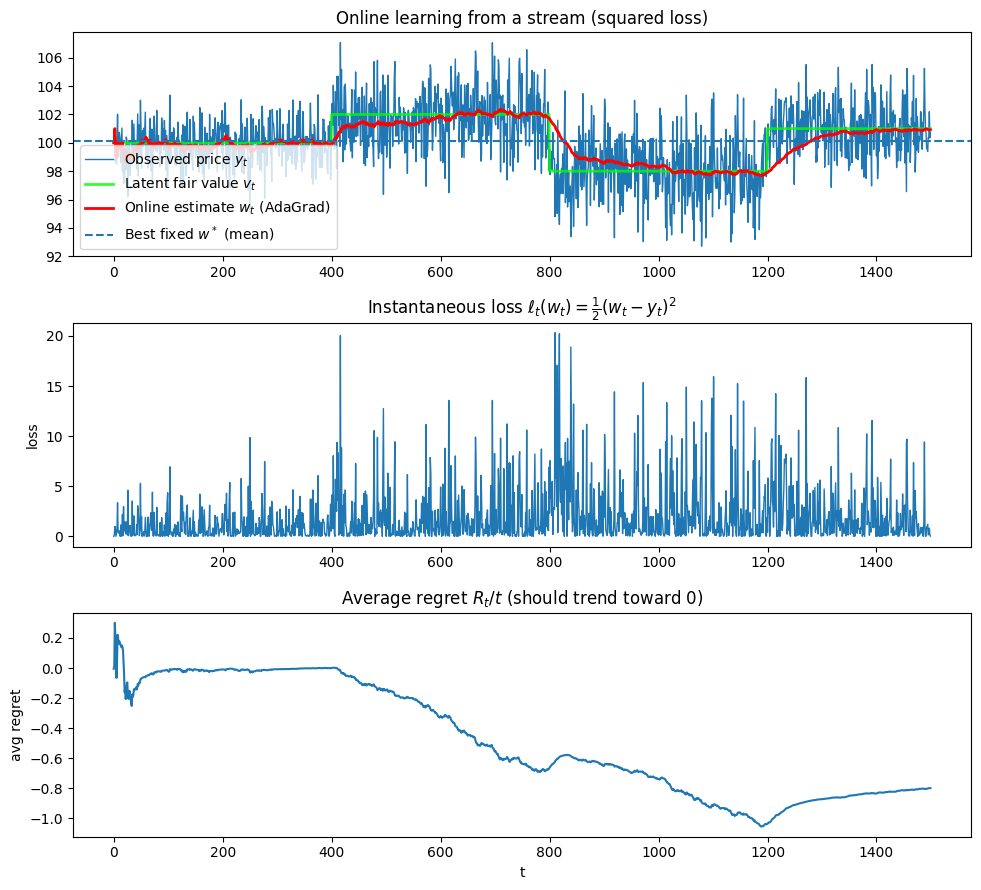 run_demo(plot=True)The top panel shows a noisy price stream (blue) with hidden piecewise fair value regimes (green), and the online AdaGrad estimate (red) tracking those regimes: it lags briefly at the change points (around t ≈ 400,800,1150) and then settles, adapting more slowly later because AdaGrad’s effective step size shrinks as gradients accumulate. This simple simulation demonstrates the core principles of online learning.