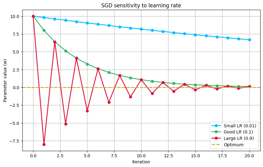 return w_historyAs you can see from the plot, the choice of the learning rate has a dramatic impact on the convergence of the algorithm. The good learning rate converges smoothly and efficiently to the optimal solution. The small learning rate also converges, but at a much slower pace. The large learning rate overshoots the optimum and oscillates around it, failing to converge in the given number of iterations. This simple example highlights the fundamental problem with a fixed learning rate and motivates the need for a more adaptive approach.