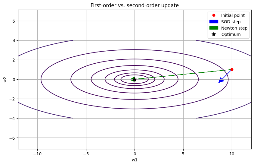w_newton = w_init - np.linalg.inv(hessian(w_init)) @ gradient(w_init)The plot shows the contour lines of a simple quadratic loss function that is elongated in the w2 direction. The SGD step, which is proportional to the negative gradient, does not point directly towards the minimum. It will take many small, zig-zagging steps to reach the bottom of the valley. The Newton step, on the other hand, takes into account the curvature of the loss function and points directly towards the minimum. This is a powerful illustration of the potential benefits of second-order methods.