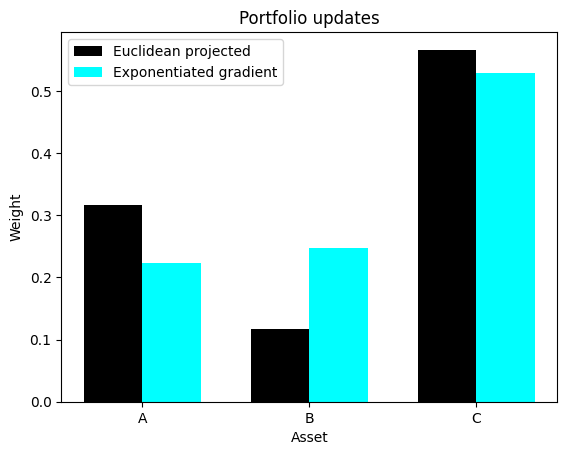 w_eg = exponentiated_gradient_update(w_init, grad, learning_rate)The Euclidean update, followed by a projection, can lead to solutions where some of the weights are set to zero, even if the gradient for that asset is not particularly large. The exponentiated gradient update, on the other hand, produces a smoother and more natural update, where the weights are adjusted multiplicatively. This can be a more desirable behavior in many portfolio optimization problems.
