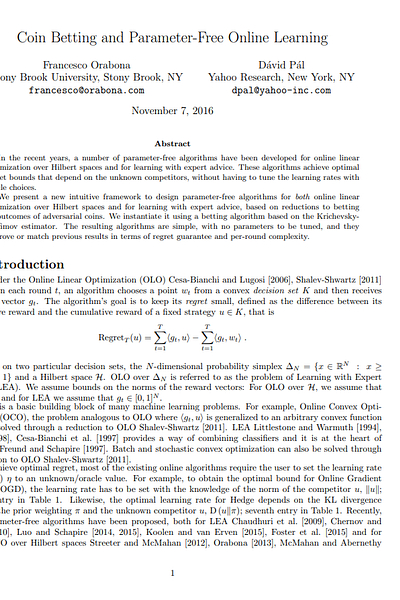 The connection between online learning and stochastic optimization is an interesting one, but it is not the only surprising connection that has been uncovered for parameter-free optimization. Another, perhaps even more counter-intuitive, connection is the one between optimization and coin-betting. It turns out that the problem of designing a good optimization algorithm is, in some sense, equivalent to the problem of designing a strategy for betting on a sequence of coin flips, that means, randomly.