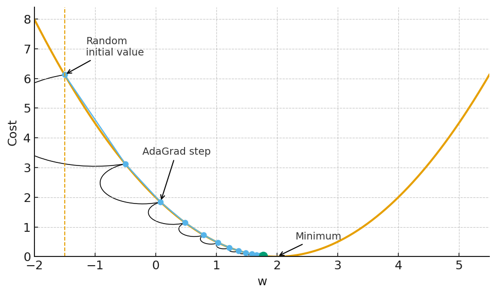 \(\Delta w_i \;=\; -\,\frac{\eta}{\sqrt{\sum g_i^{2}}}\, g_i\)This means parameters that have received large, frequent gradient updates in the past (high sum of squares) will have their effective learning rate shrink. Infrequent parameters will see larger updates. The algorithm learns the geometry of the problem and adapts its step sizes accordingly, effectively creating its own learning rate schedule on the fly.