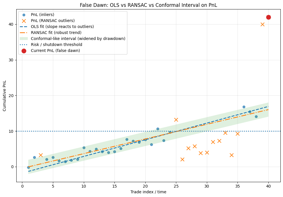 An OLS regression would immediately react to these large positive values, flipping the slope β from negative to positive, signaling “all clear.” A trader looking at the raw PnL would see a sharp uptick and feel relief. However, the RANSAC algorithm, robust to outliers, might reject these new profits as anomalies if they don’t fit the dominant (negative) trend established by the majority of trades in the window. To RANSAC, this is just high-magnitude noise, not a structural return to form.